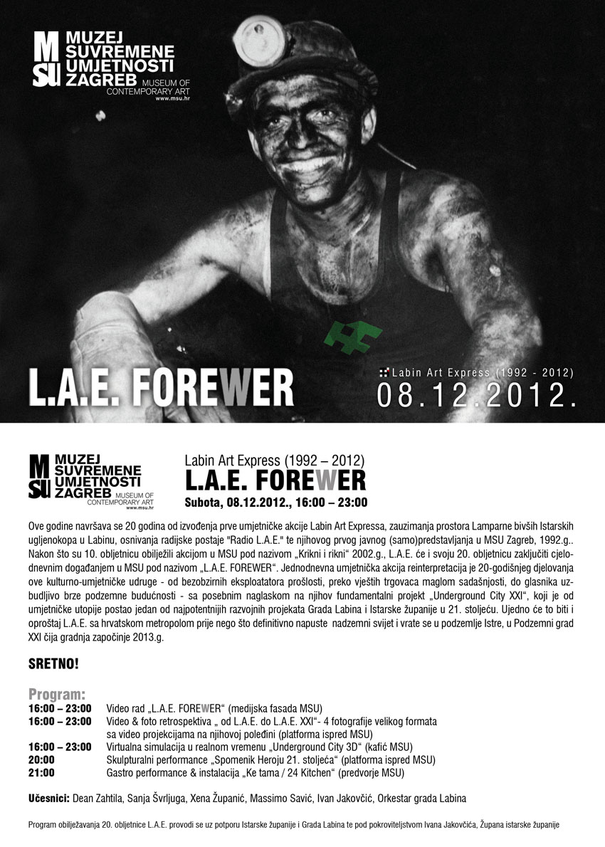 Program obilježavanja 20. obljetnice Labin Art Expressa biti će ove godine zaključen jednodnevnim događanjem u Muzeju suvremene umjetnosti u Zagrebu, gdje će u subotu 08.12.2012.g. biti predstavljeno 20-godišnje djelovanje ove umjetničke grupe.