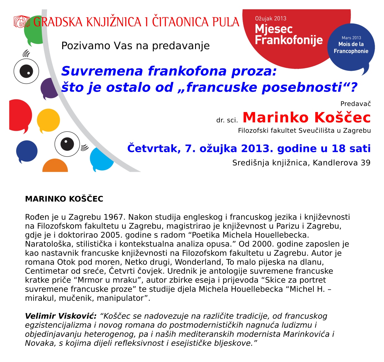 Obilježavanje Mjeseca frankofonije 2013. u Gradskoj knjižnici i čitaonici Pula započinje u četvrtak, 7. ožujka 2013. godine u 18 sati predavanjem “Suvremena frankofona proza: što je ostalo od „francuske posebnosti”? dr. sc. Miljenka Koščeca, profesora francuske književnosti na Katedri za francuski jezik Filozofskog fakulteta u Zagrebu.