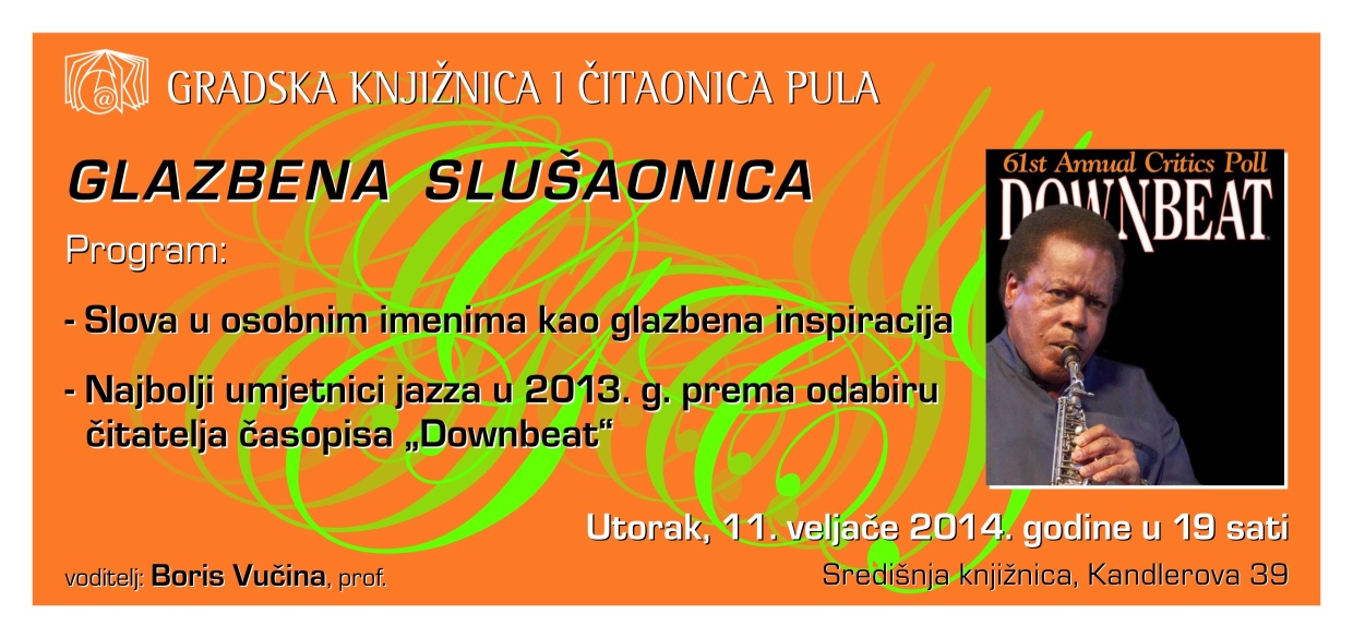 [lang_hr]U Središnjoj knjižnici Gradske knjižnice i čitaonice Pula održat će se nova Glazbena slušaonica u utorak, 11. veljače 2014. godine u 19 sati. Program obrađuje temu slova u osobnim imenima kao glazbena inspiracija i predstavljaju se najbolji umjetnici jazza iz 2013. godine prema odabiru čitatelja časopisa Downbeat. Voditelj Glazbene slušaonice je prof. Boris Vučina.[/lang_hr]