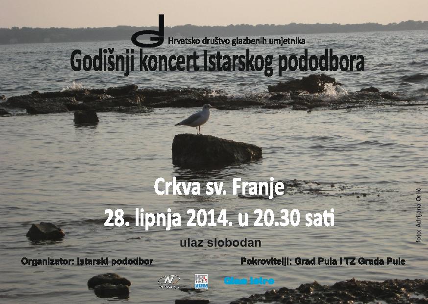 [lang_hr]Članovi Istarskog podod­bo­ra Hrvatskog druš­tva glaz­be­nih umjet­ni­ka i gos­ti, odr­žat će kon­cert 28. lip­nja s počet­kom u 20 i 30 sati u pul­skoj crk­vi Sv. Franje. Ulaz je slobodan.[/lang_hr]