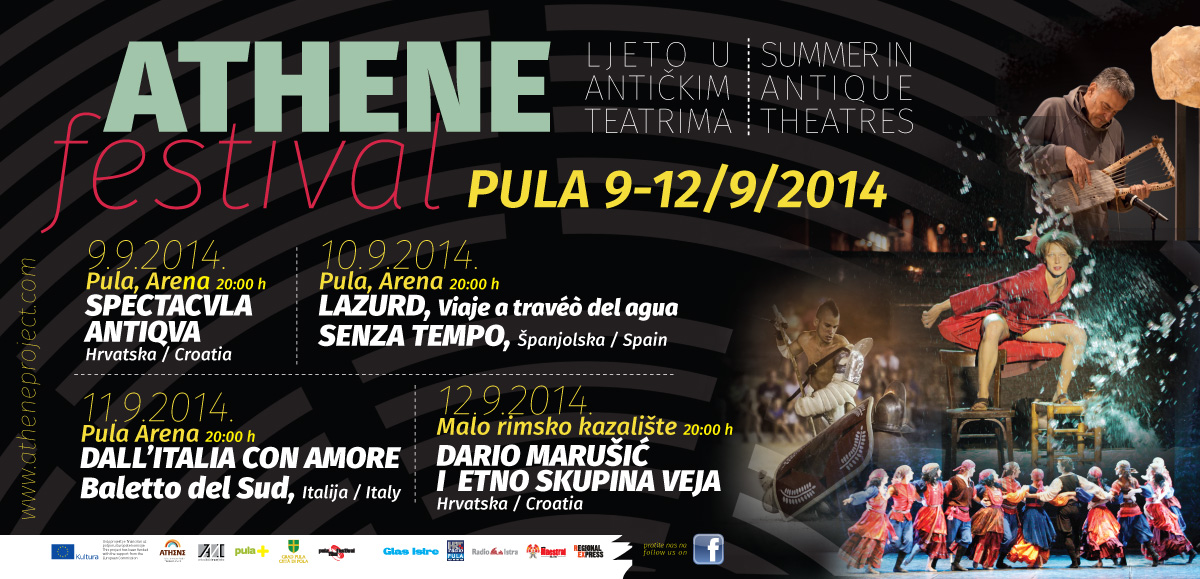 [lang_hr]Manifestacija “Ljeto u antičkim teatrima” održat će se u Puli od 9. do 12 rujna. Arheološki muzej Istre i Pula bit će domaćini i ponudit će svoje antičke teatre – Arenu i Malo rimsko kazalište, za pozornice bogatog programa. U četiri dana moći će se izabrati program koji odgovara različitim željama i potrebama, te uroniti u mješavinu kultura, događaja i doživljaja Athene Festivala. [/lang_hr]