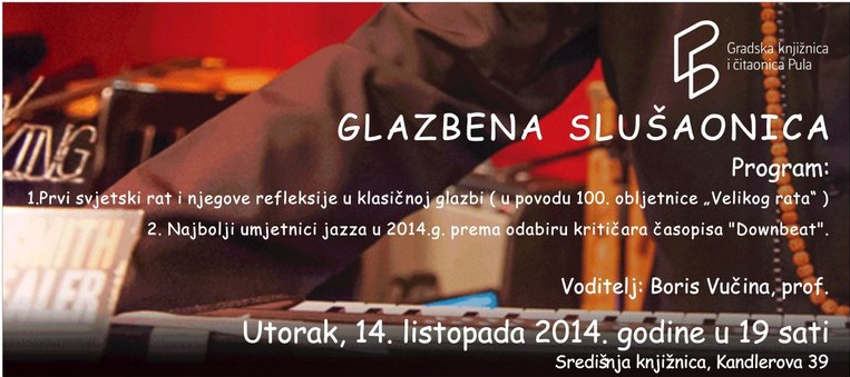 [lang_hr]Glazbena slušaonica pulske Gradske knjižnice i čitaonice, nakon ljetne pauze nastavlja sa svojim programom u utorak, 14. listopada u 19 sati. Voditelj slušaonice prof. Boris Vučina i ovaj je put pripremio zanimljive teme: Prvi svjetski rat i njegove refleksije u klasičnoj glazbi i Najbolji umjetnici jazza u 2014. godini prema odabiru kritičara časopisa Downbeat.[/lang_hr]