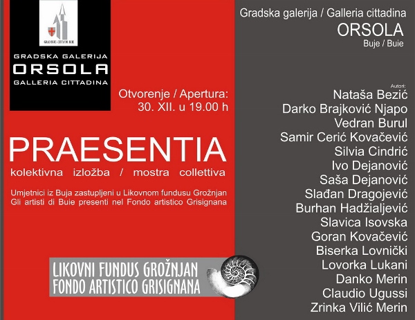 [lang_hr]Kolektivna izložba naziva “Praesentia” na kojoj će biti izloženi radovi bujskih umjetnika zastupljeni u Likovnom fundusu Grožnjan bit će otvorena u utorak 30. prosinca u 19 sati u gradskoj galeriji Orsola u Bujama. Izložbu i projekt predstavit će Eugen Borkovsky, a zastupljeni autori su: Nataša Bezić, Darko Brajković Njapo, Vedran Burul, Samir Cerić Kovačević, Silvia Cindrić, Ivo Dejanović, Saša Dejanović, Slađan Dragojević, Burhan Hadžialjević, Slavica Isovska, Goran Kovačević, Biserka Lovnički, Lovorka Lukani, Danko Merin, Claudio Ugussi, Zrinka Vilić Merin.[/lang_hr]