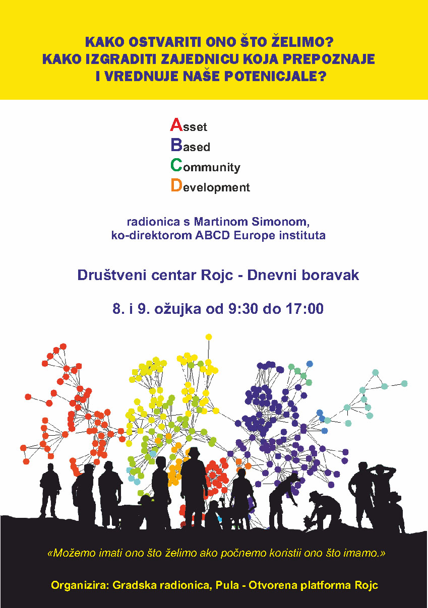 U sklopu Otvorene platforme Rojc, udruga Gradska radionica 8. i 9. ožujka u Dnevnom boravku Društvenog centra Rojc organizira cjelodnevne radionice o community buildingu (izgradnji zajednice) po Asset Based Community Development metodi. Radionice će voditi ugledni britanski društveni inovator, aktivist i pisac Martin Simon – viši suradnik u Nurture Developmentu, ko-direktor ABCD Europe te vodeći britanski konzultant i trener za ABCD metodu.