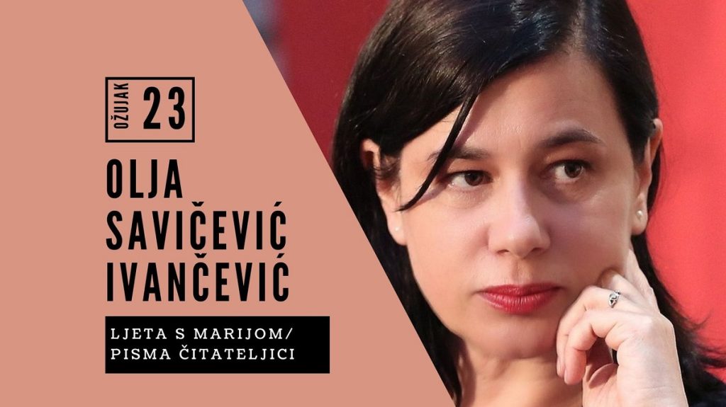 Predstavljanje dvije najnovije knjige Olje Savičević Ivančević – „Ljeta s Marijom“ (Fraktura, 2022) i „Pisma čitateljici“ (Buybook, 2023). bit će održano u četvrtak, 23. ožujka u 19 sati u Klubu & knjižari Giardini 2.
