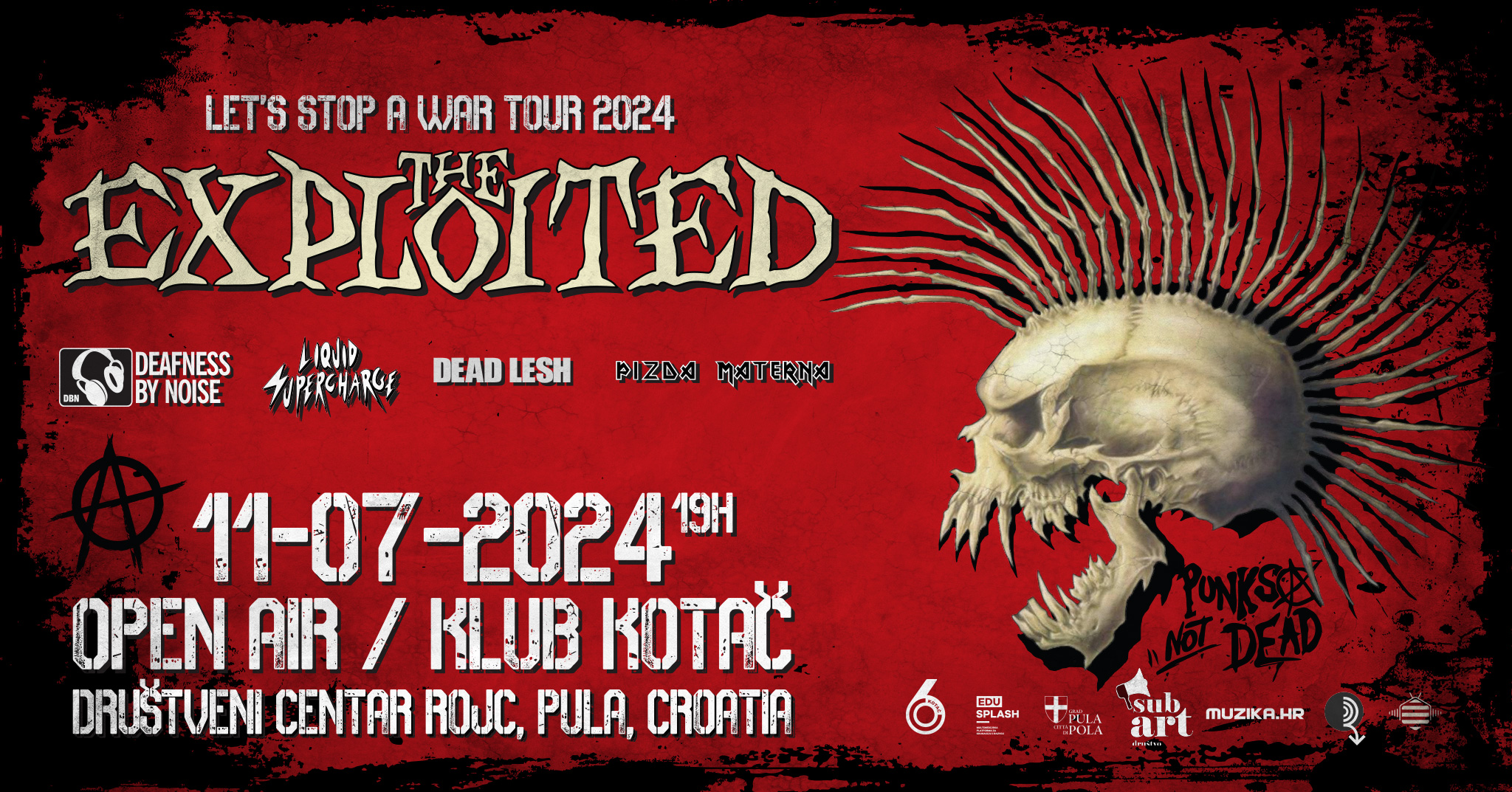Koncert legendarnog punk banda The Exploited u sklopu njihove turneje Let’s Stop a War Tour 2024 bit će održan 11. srpnja na otvorenoj pozornici kluba Kotač u DC‑u Rojc. Osim njih nastupat će i Dead Lesh, Pizda materna, Deafness by Noise i Liquid Supercharge.