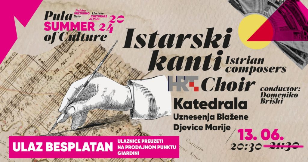 Zbog najavljenih nepovoljnih vremenskih prilika, umjesto u Malom rimskom kazalištu koncert „Istarski kanti“ u izvedbi Zbora HRT‑a održat će se u četvrtak, 13. lipnja u pulskoj katedrali Uznesenja Marijina (Trg Sv. Tome 2) s početkom u 20.30 sati (umjesto 21.30 kako je bilo ranije najavljeno).