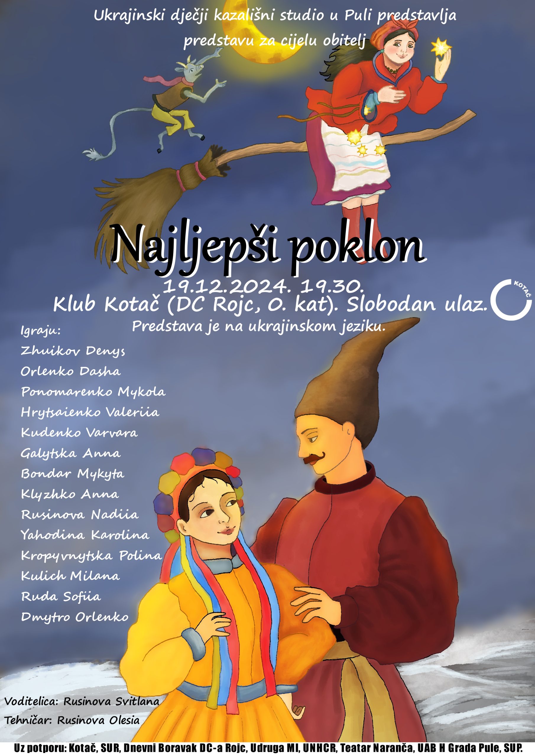 Ukrajinski Dječji kazališni studio u Puli predstavlja predstavu za cijelu obitelj “Najljepši poklon!” koja će biti održana u četvrtak, 19. prosinca u 19.30 sati u klubu Kotač u DC‑a Rojc.