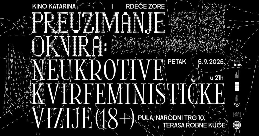 Kino Katarina u suradnji s filmskim kolektivom ljubljanskog festivala Rdeče zore u petak, 5. rujna s početkom u 21 sat, na terasu pulske robne kuće donosi program Preuzimanje okvira – Neukrotive kvirfeminističke vizije. Program je namijenjen za punoljetne osobe.