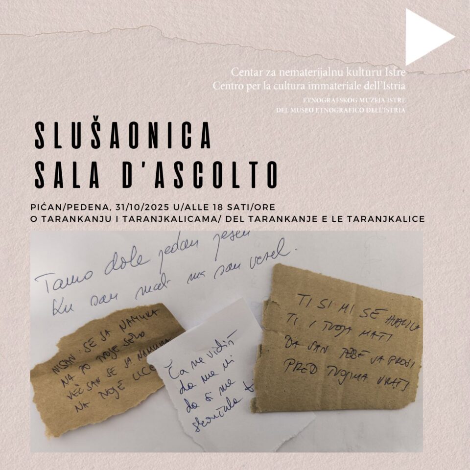 Centar za nematerijalnu kulturu Istre Etnografskog muzeja Istre u Pićnu, organizira Slušaonicu koja će biti održana u petak, 31. listopada s početkom u 18 sati. Na radionici koju će voditi Noel Šuran će svi zainteresirani naučiti kako nastaju, kako se mijenjaju i prenose tradicijski tekstovi u prvoj tradiciji – podstil tarankanje.