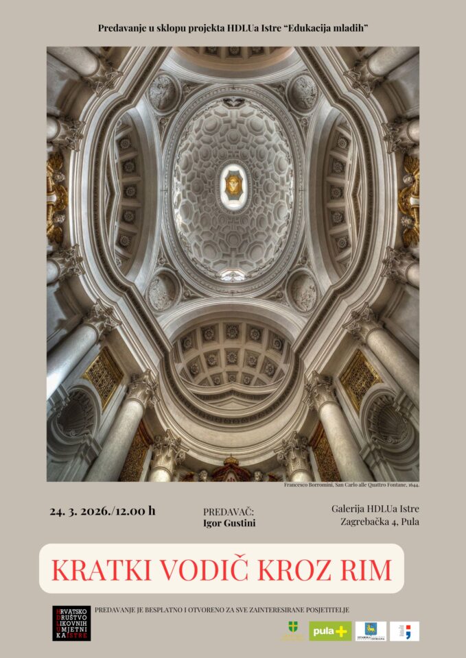 Drugo ovogodišnje predavanje u sklopu projekta HDLU‑a Istre “Edukacija mladih” – Kratki vodič kroz Rim održat će se će u utorak, 24. ožujka, u 12 sati u galeriji HDLU‑a Istre.