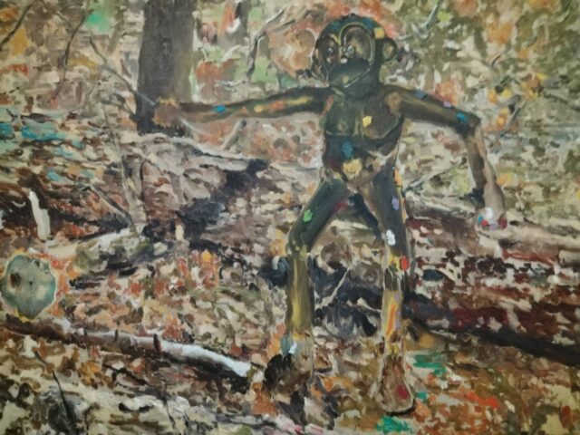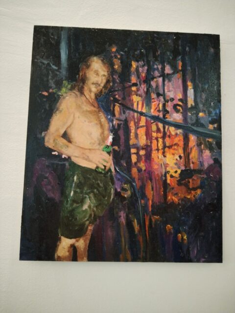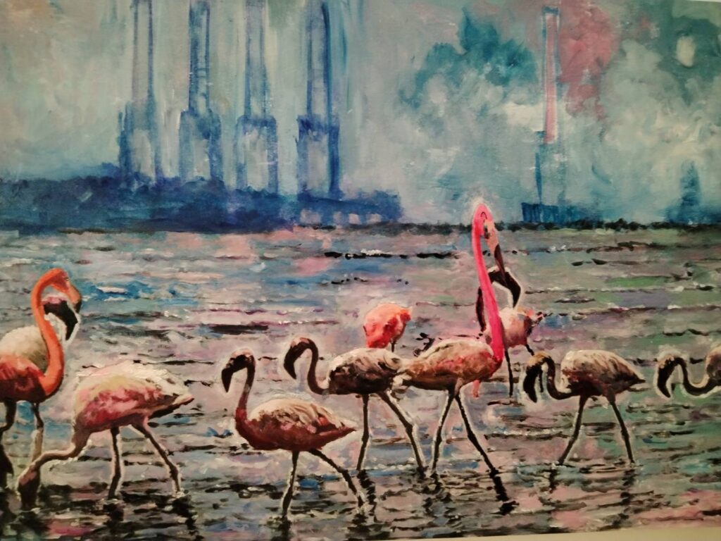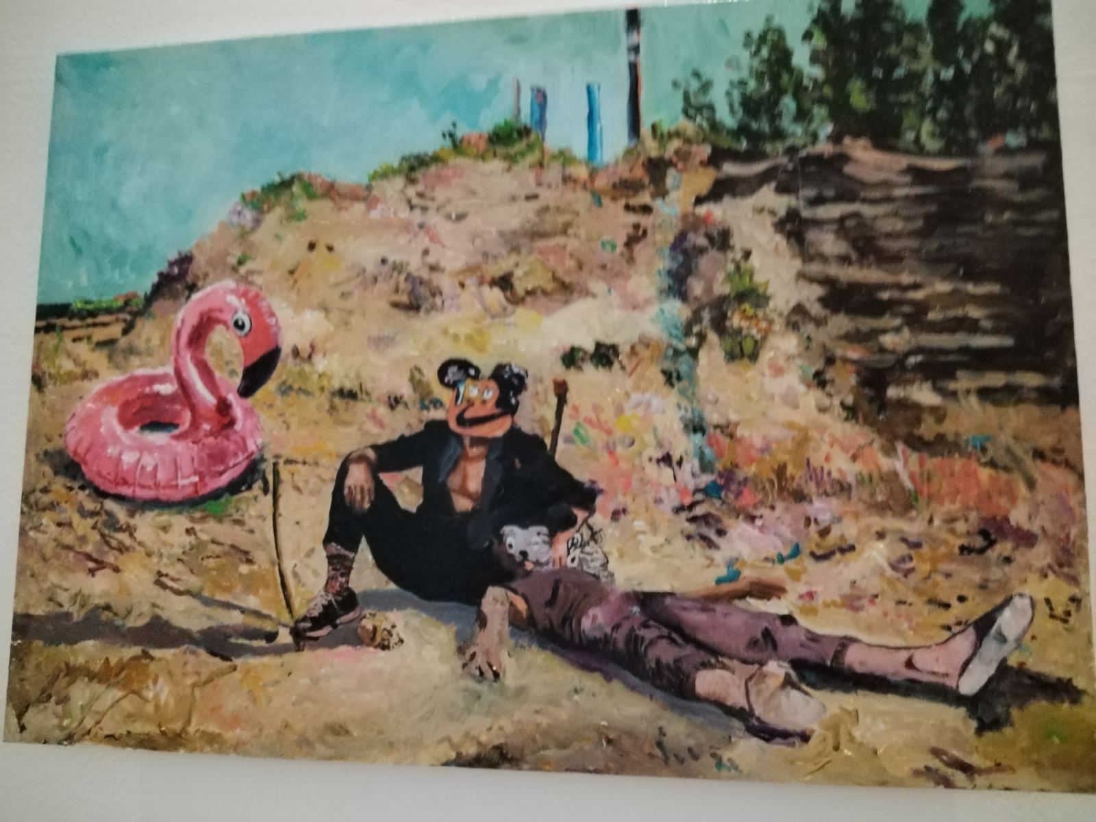 Druga izložena slika, portret pokojnog pulskog oriđinala Fikreta koji krasi i deplijan i plakat izložbe, nastala je na nagovor Dražena Majića, urednika Istre24, koji se posljednje vrijeme i glazbeno aktivirao te je uz ostale snimio vrlo osobnu pjesmu o teškom trenutku iz svoje mladosti, kad mu je upravo kontroverzni Fikret pomogao doći kući. „Pokojni Fikret je osebujan lik iz pulske suvremene scene. Bio je poseban na više razina, jako opasan tip kojeg su se svi bojali jer se često tukao. Površno sam ga poznavao, ali oni koji su ga znali tvrde da je bio jako pravedan. Kad sam sliku objavio na FB‑u razvila se zanimljiva diskusija. Neki su mi zamjerali zašto sam ga išao slikati kad je bio propalica i siledžija, dok su drugi koji su ga znali u bolim izdanjima pisali: Bio je jako OK, pošten, uvijek nas je branio… Uz ostalo je netko napisao da su kao klinci s njime odlazili na neku baru oko Pule koju su zvali Trentava i lovili žabe. Tako sam ovu sliku nazvao „Fikret u Trentavi“, kazao je Šumonja te nastavio opisivati sljedeću sliku na kojoj su flamingosi, kao još jedan čest motiv njegovih novijih radova: „Ovo je jedan moj klasični distopijski pejzaž koji možda najbolje opisuje naslov ove izložbe. Flamingosi su čest motiv u suvremenom slikarstvu diljem planeta. Svaki suvremeni slikar koji „drži do sebe“ ih je slikao. Međutim, ja se s njima ironično sprdam, stavljajući ih u ambijente u koje ne pripadaju i često ih kombiniram s plastičnim šlaufovima flamingosima. U pozadini se vidi neki industrijski distopijski pejzaž koji s pticama u prvom planu daje taj kontrast našeg propalog potrošačkog društva, govori o tome što danas radimo od našeg planeta i svojevrsna je kritika takvog društva i civilizacije. Treća slika manjeg formata je eklektička kompozicija sklepana od svačega, s pozadinom koju sam „ukrao“ od jednog japanskog slikara. To je neki princip po kojem radim, najviše kradem…“, našalio se na kraju.