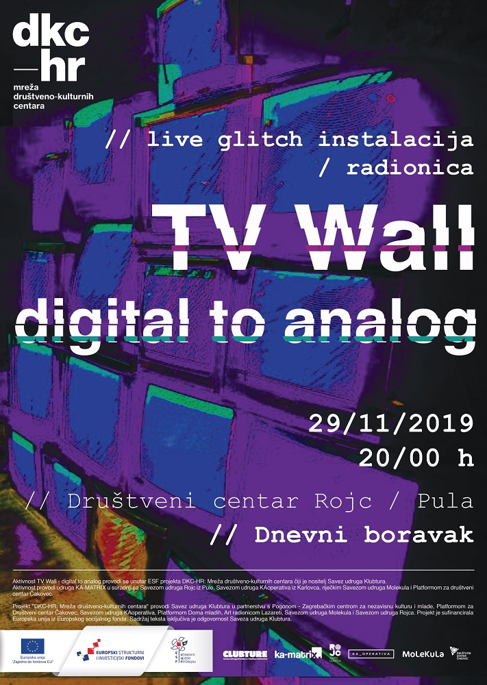 Aktivnost TV Wall – digi­tal to ana­log pro­vo­di se unu­tar ESF pro­jek­ta DKC-HR: Mreža druš­tve­no-kul­tur­nih cen­ta­ra čiji je nosi­telj Savez udru­ga Klubtura.