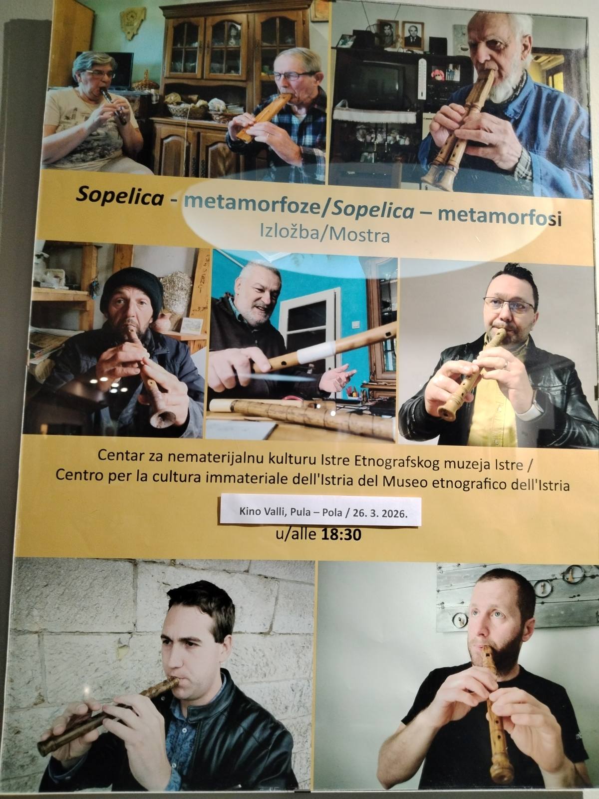 Ovom je prigodom u foajeu postavljena i mini izložba „Sopelica-metamorfoze“ koja sadrži video radove, glazbene instrumente i popratne edukativne plakate, a ranije je već predstavljena u CENKI‑u – Centru za nematerijalnu kulturu Istre koji Noel Šuran vodi u Pićnu. Objasnio je kako se odlučio predstaviti upravo taj istarski instrument koji je u etnomuzikološkim krugovima nepravedno zapostavljen (na uštrb npr. miha i roženica o kojima ima puno više znanstvenih radova). Sopelice imaju mnoge varijacije i „svaki je tu ništo doda“, a njemu su bile pomalo dosadne pa je na njima „počeja njurgati“. Tu svoju inovaciju je odmah i demonstrirao, zasviravši na sopelici jednu melodiju uz nazalno „pjevanje“ drugog glasa. Zaključio je kako ova izložba „Ni niš pretenciozno, ma je simpatična“, a tada mu se iz publike neočekivano obratio dječak koji je dugo i strpljivo držao ruku u zraku i ponosno rekao „Rajko je moj tata, a i ja sam napravio film, s igračkama.“